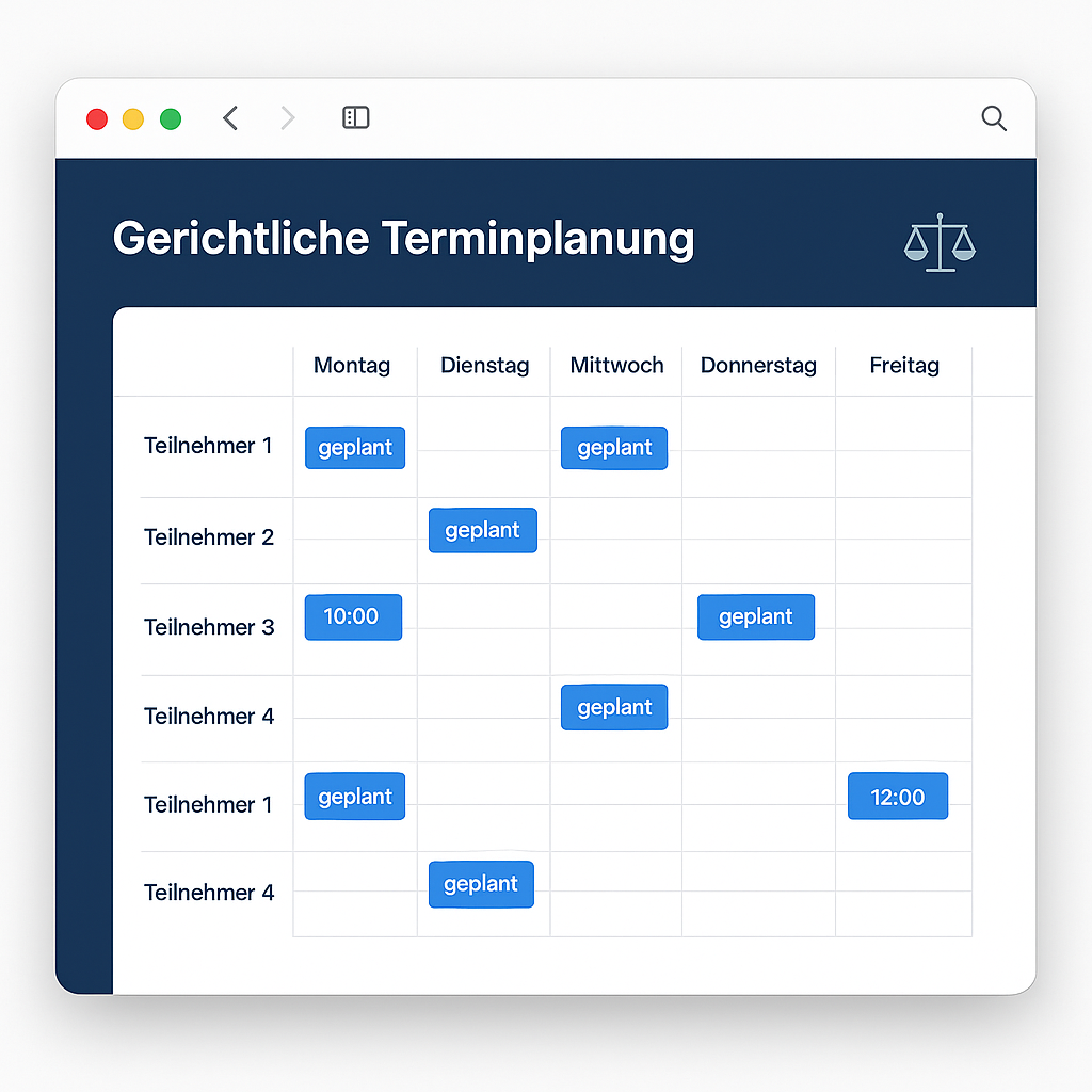 LawDate ist eine moderne Softwarelösung zur Terminplanung für Gerichte und Rechtsanwälte. Sie verbindet juristische Seriosität mit smarter Technologie und sorgt für eine effiziente, transparente und fehlerfreie Organisation von Terminen.