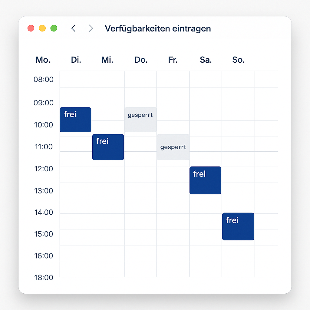 Zentrale Erfassung von Verfügbarkeiten und Sperrzeiten – schnell, sicher und ohne personenbezogene Daten direkt in unserer Onlineapp.